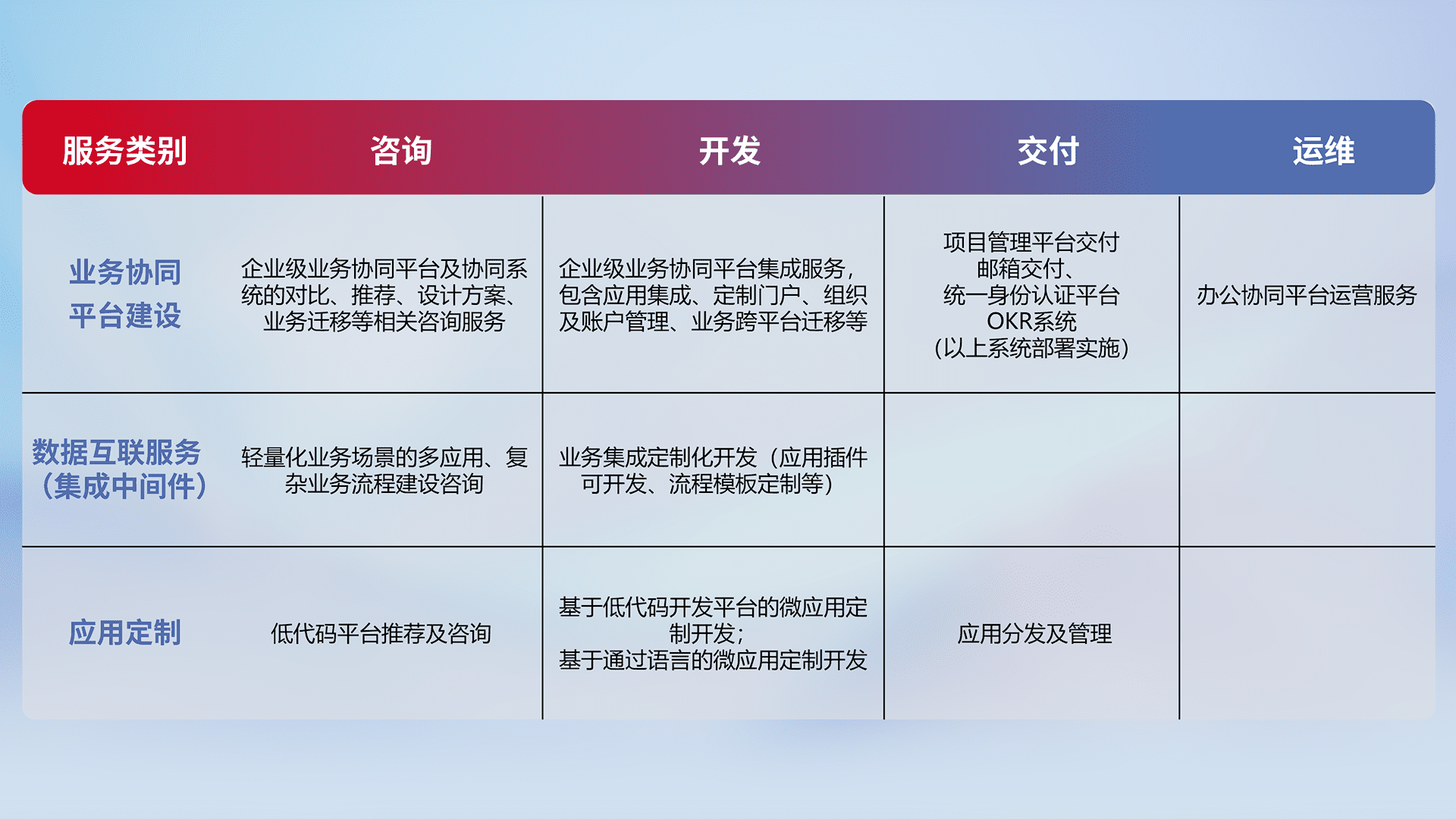 针对钉钉、、企微、、IDaas等平台级产品提供产品的规划、、、方案、、、、交付、、定制化开发等服务,,实现如统一协同办公、、、、智能客户服务、、、混合会议管理、、、智能数据查询、、、、等业务场景,,,实现数字化转型。。。。