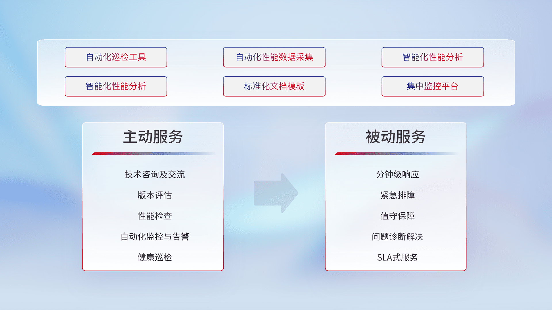 智能化工具和标准化文档,,,,保障服务质量,,提供主动服务(包含技术咨询、、、、版本评估、、、性能检查、、自动化监控与告警、、、健康巡检)和被动服务包含(分钟级响应、、、紧急排障、、值守保障、、、、问题诊断解决、、、SLA服务)。。。。